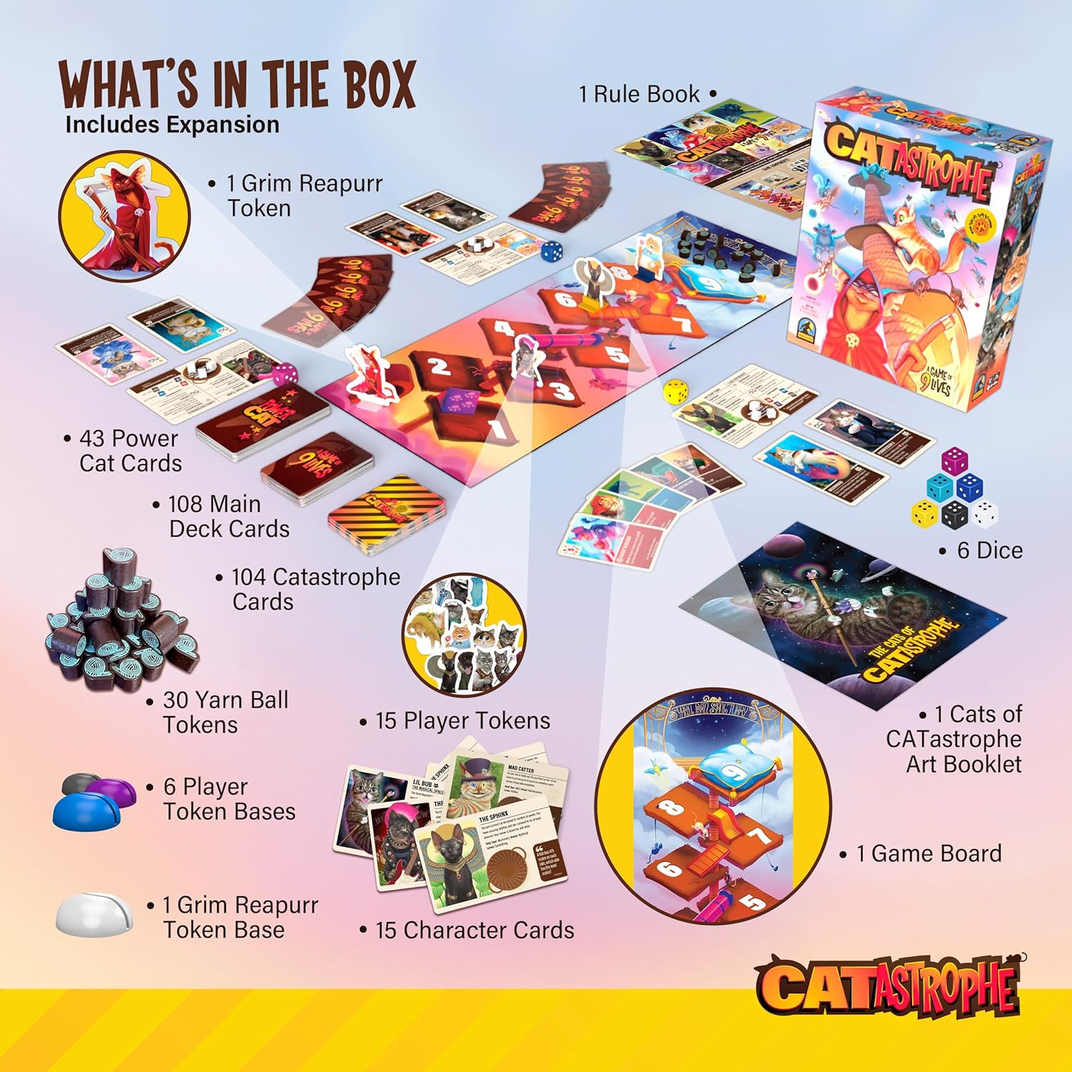 Includes the original base game (everything you need to play) plus the special expansion pack, which adds 7 new characters, 7 new character player tokens, 16 new Power Cat Cards, and 52 additional CATastrophe cards. CATastrophe cards will have you competing in exciting mini games bringing out the animal in every player. More mayhem means more fun!